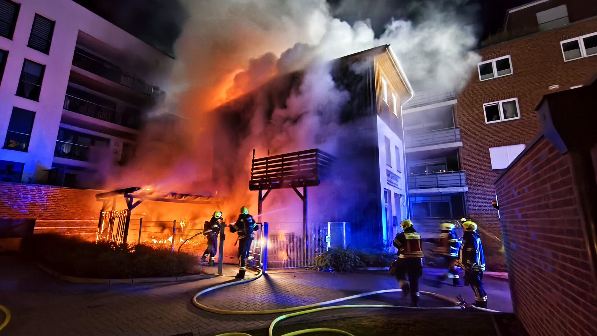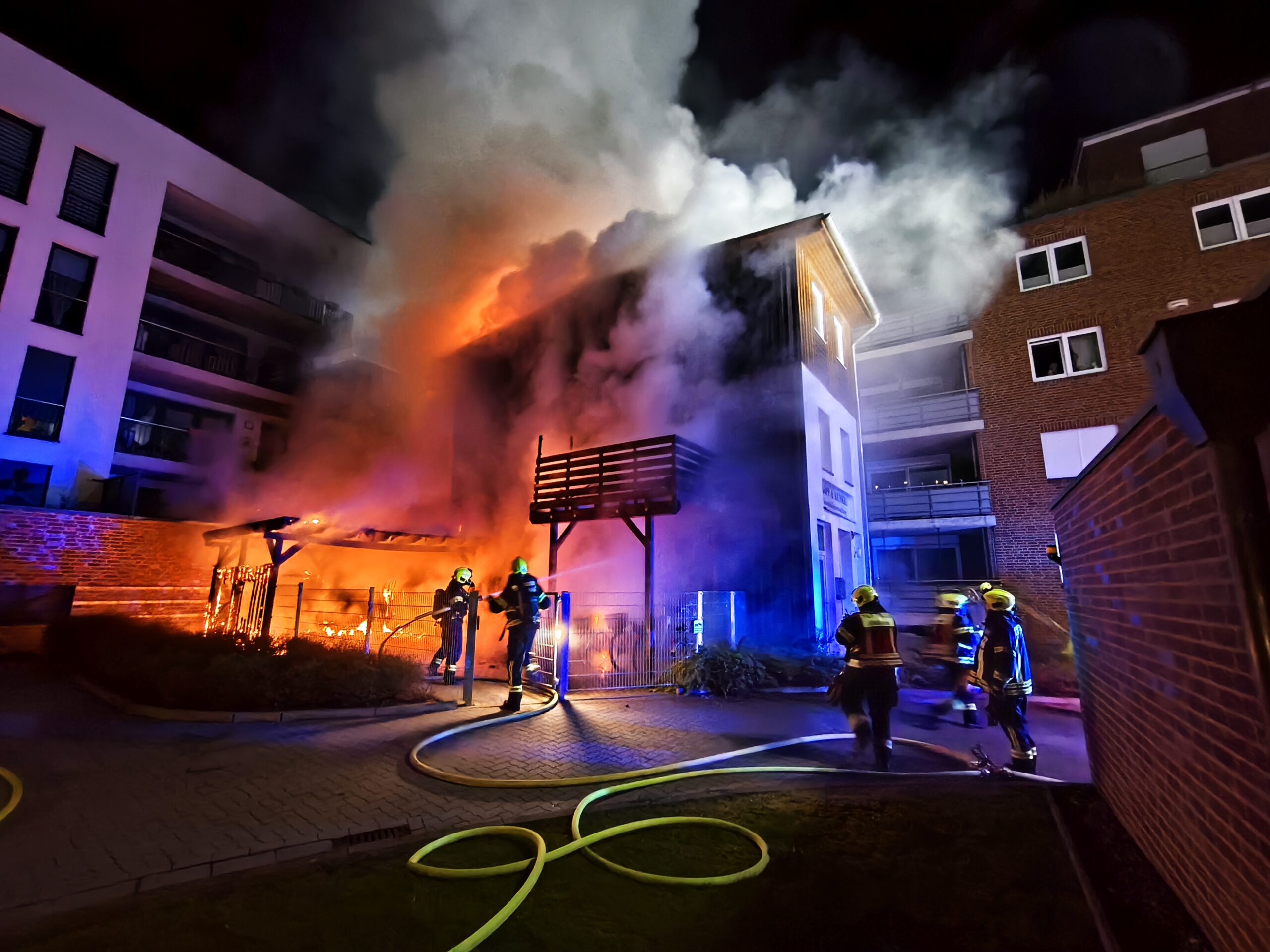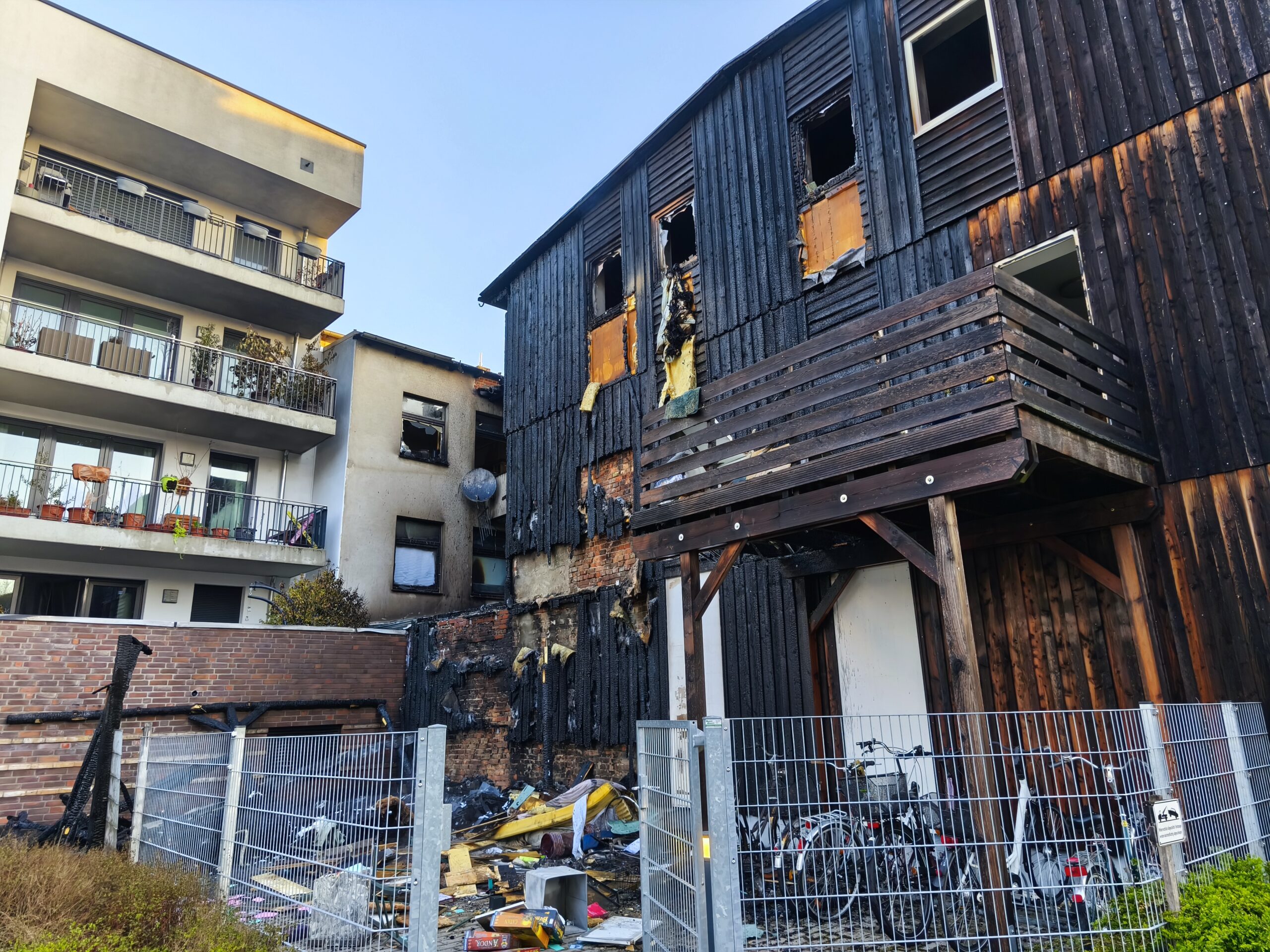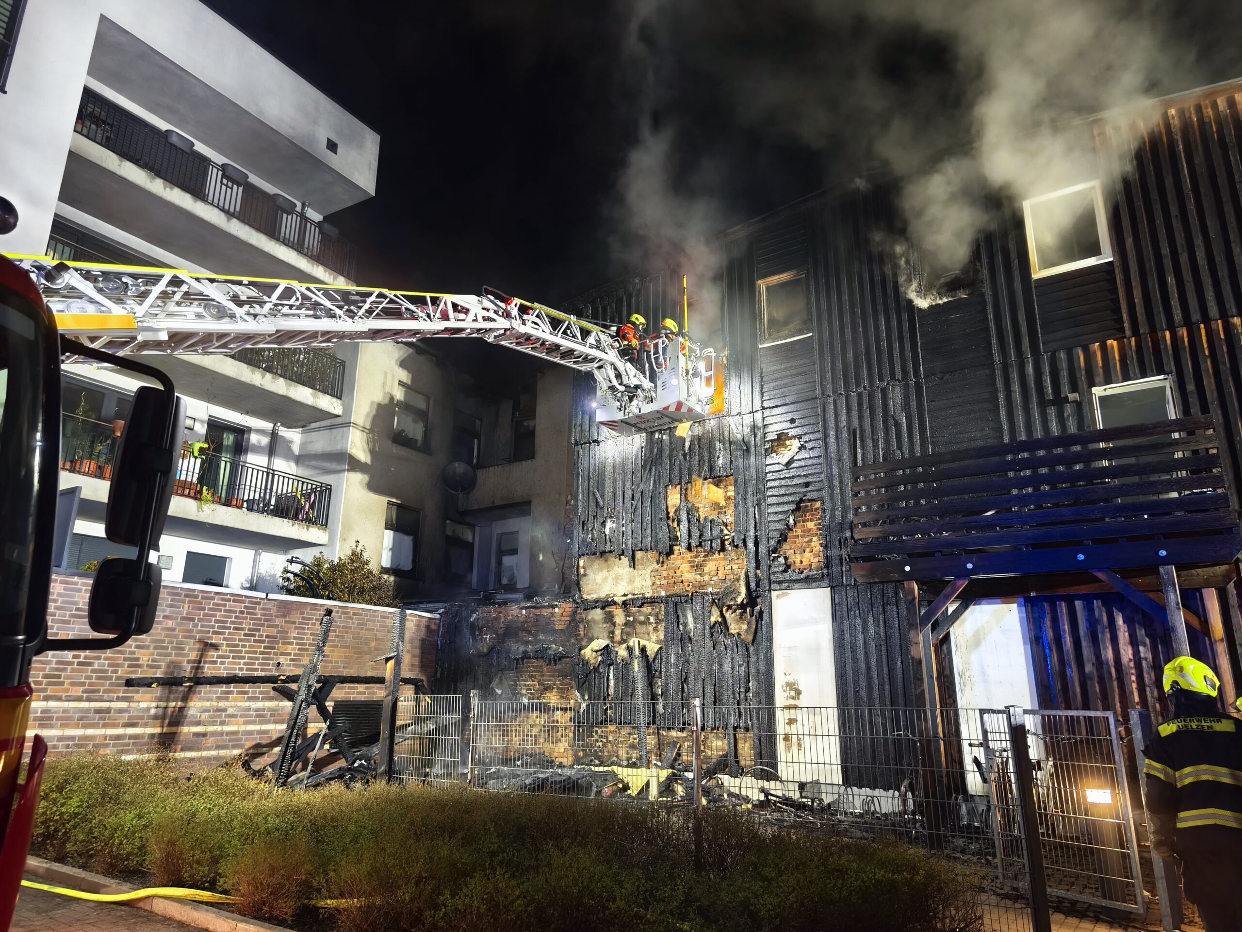 Am 11.04.2026 gegen 03:00 Uhr wurde der Polizei der Brand von Müllcontainern in einem Innenhof zwischen Mehrfamilienhäusern in der Mühlenstraße mitgeteilt. Die Flammen griffen auf ein Carport und anschließend auf ein Wohnhaus über. Die Feuerwehr begann umgehend mit den Löscharbeiten. Es wurden rund 35 Personen aus den betroffenen Wohnungen evakuiert. Zudem wurden ein Hamster und eine Katze gerettet. Zwei Personen wurden aufgrund von Rauchgasintoxikationen in ein Klinikum verbracht. Die brandbetroffenen Wohnungen sind nicht bewohnbar. Die Löscharbeiten dauerten mehrere Stunden an. Der Sachschaden wird nach ersten Schätzungen auf rund 800.000 Euro beziffert. Die Polizei hat die Ermittlungen zur Brandursache aufgenommen. Nach ersten Erkenntnissen und Zeugenaussagen soll eine männliche Person am Brandausbruchsort gesehen worden sein, die versucht habe die Flammen zu löschen. Diese Person konnte nicht mehr angetroffen werden. Die Polizei kann eine fahrlässige Brandstiftung nicht ausschließen. Die weiteren Ermittlungen dauern an. Hinweise nimmt die Polizei Uelzen, Tel. 0581-930-0, entgegen.