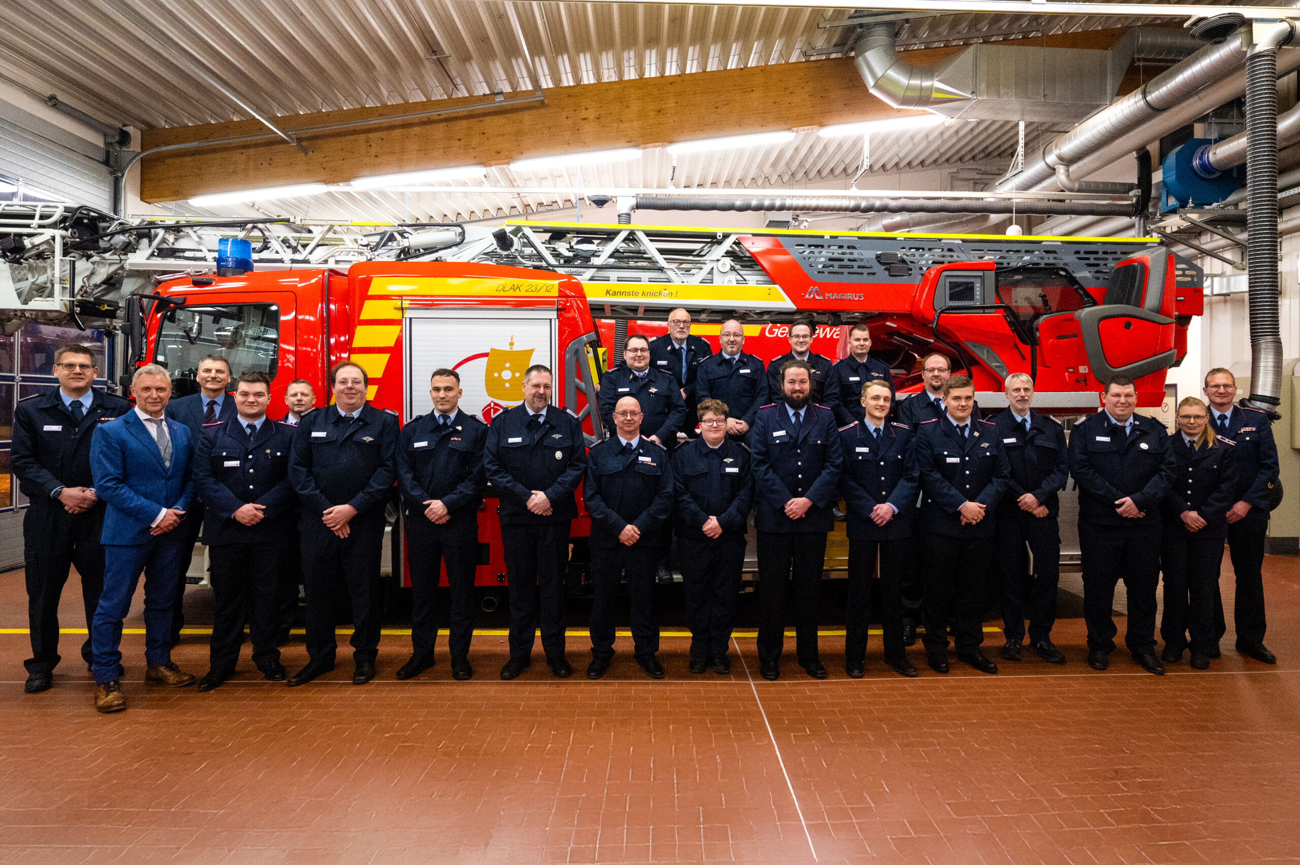 Vor der Drehleiter traten Gäste, Ernannte, Beförderte und Geehrte sowie Kameradinnen und Kameraden für ein Foto an.